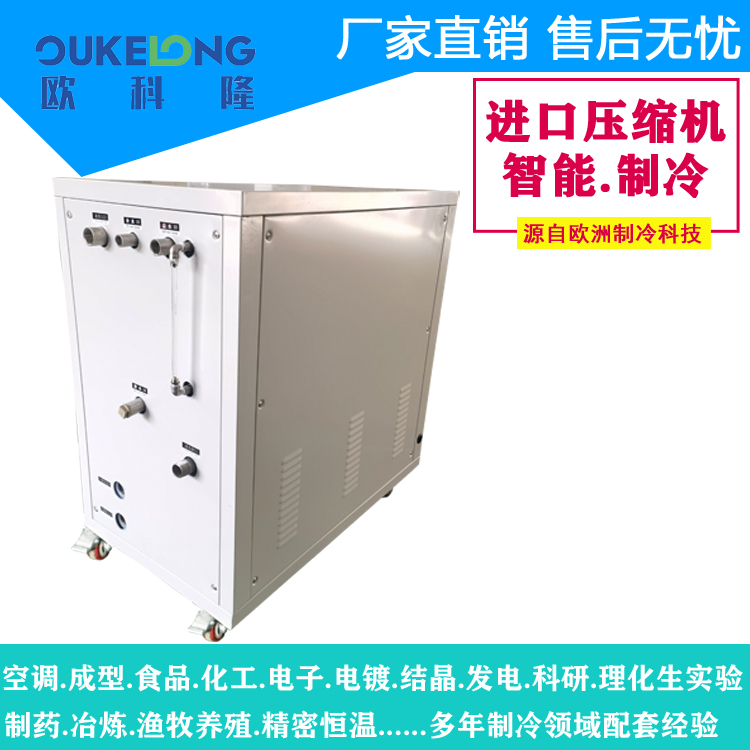 歐科隆制冷水冷箱式冷水機組詳細特點介紹.制冷心臟采用全密封低噪音,振動小,采用高效能省電國際著名名牌壓縮機(美國谷輪牌,日本三洋,日本大金,法國美優(yōu)樂等),電器控制全部采用進口名牌原件,熱交換器采用殼管式冷凝器,換熱效能高,便于清洗保養(yǎng)。