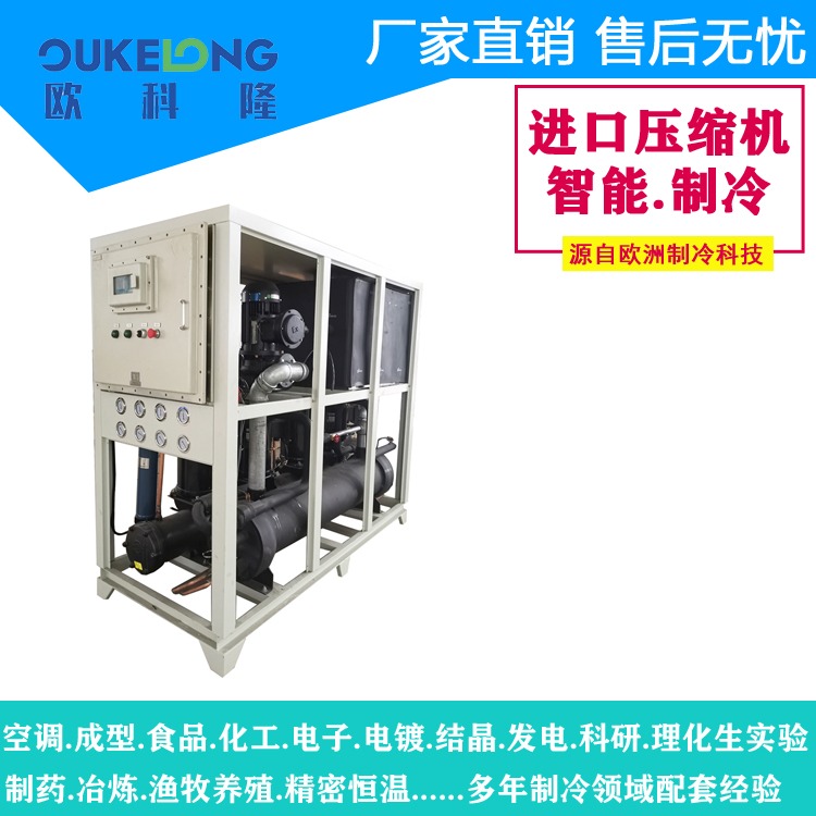 歐科隆40匹Ex防爆水冷箱式冷水機(jī)組是一款通過國(guó)家防爆認(rèn)證(Ex dⅡB T4 Gb)的專業(yè)工業(yè)制冷設(shè)備,制冷量140kW,專為石油、化工、制藥等易燃易爆環(huán)境設(shè)計(jì)。機(jī)組采用正壓防爆箱體結(jié)構(gòu),關(guān)鍵防爆部件均符合ATEX標(biāo)準(zhǔn)。